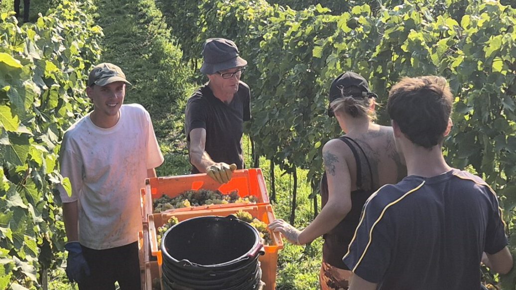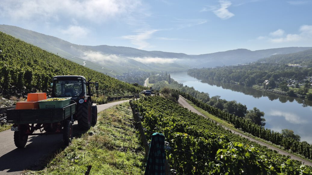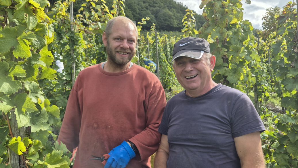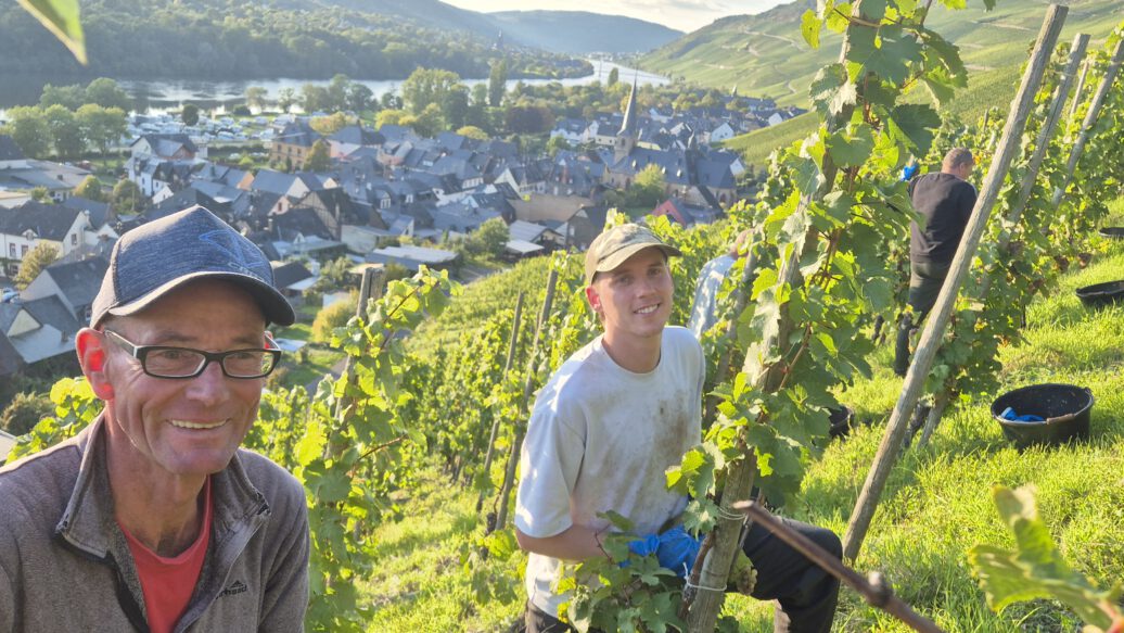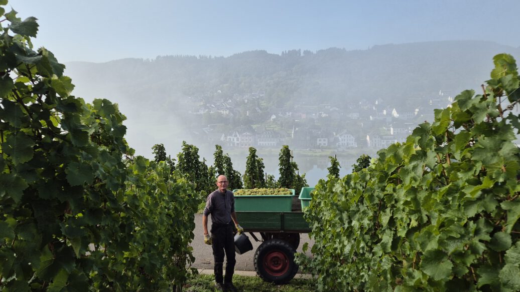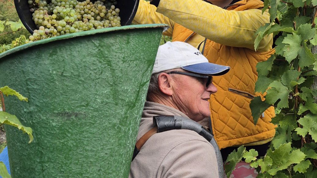 We started harvesting on September 15, 2025. While the health of the grapes varied greatly, we had to rethink and adjust our “picking strategy” from day to day. A strict, careful selection at the vine and careful but quick work were absolutely necessary to achieve perfect results. Once again, we were grateful to have our long-standing, experienced harvest team at our side, reinforced for the first time in 2025 by Philipp Veser, who, together with Mr. Amiri, takes care of our vineyards during the entire year. Further, very appreciated help came from interns, friends, and family. After a little more than three weeks, we were able to successfully complete the harvest on October 6, 2025, – the earliest end of the harvest in the history of our winery.